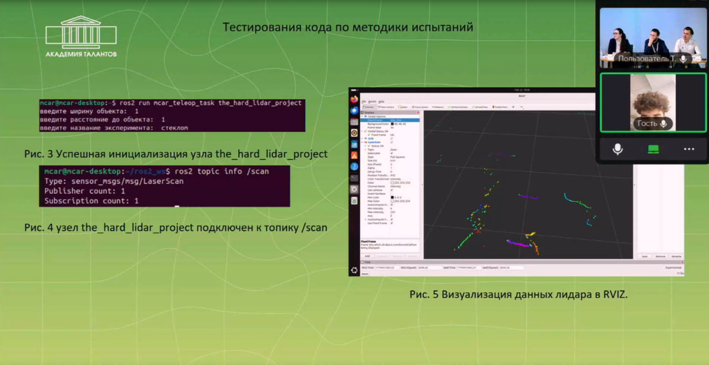 В рамках секции трое конкурсантов под руководством Владимира Воронова представили проекты, объединённые тематикой беспилотных систем и применением лидарных технологий. Экспериментальная часть исследований выполнялась на базе разработки Лаборатории ПСПОД – малогабаритного автономного колесного робота (МКАР), что позволило участникам проводить испытания в условиях, приближенных к реальным задачам робототехники и автономной навигации.