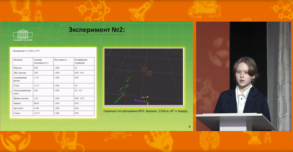 Проект Марии Шичаниной был посвящён исследованию погрешностей лидарных измерений при сканировании материалов с различными отражающими свойствами. В ходе работы были проведены серии экспериментов с девятью типами материалов – от стекла и зеркала до металлов и полимеров – при различных расстояниях и углах наклона. Полученные результаты показали, что наибольшие искажения возникают при работе с прозрачными и зеркальными поверхностями, особенно в ближней зоне, где лазерный луч может либо проходить сквозь материал, либо отражаться под углом, формируя ложные данные.